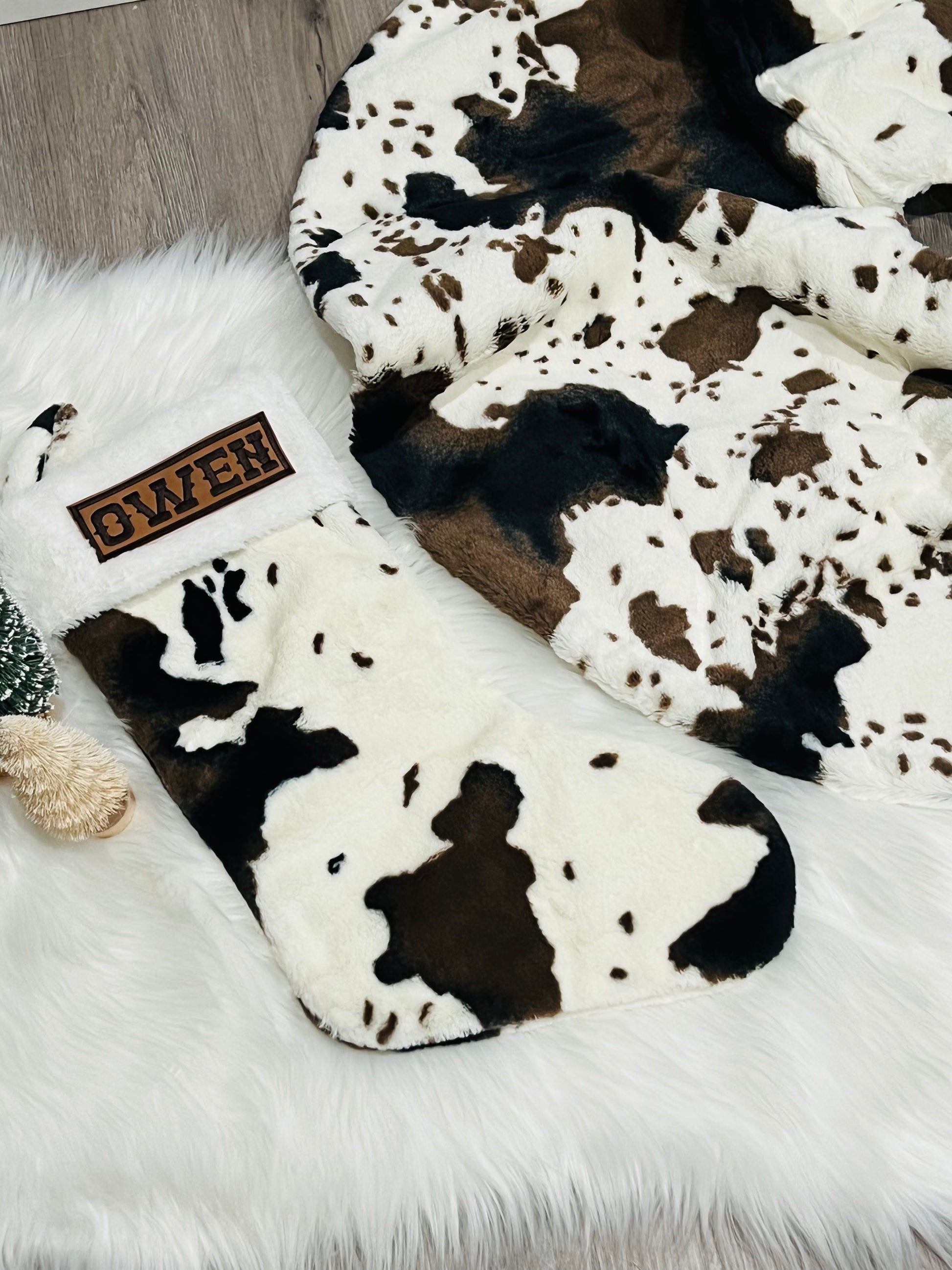 MATERIAL—> Cow print is a fleece material, red and white are knitted, cow has a Velcro closure, red and white are ties